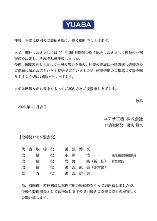去る11月の当社株主総会及び取締役会において新しい役員が選任されましたのでご挨拶いたします。